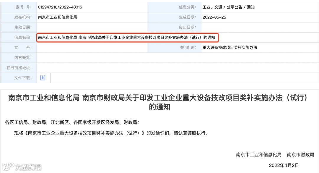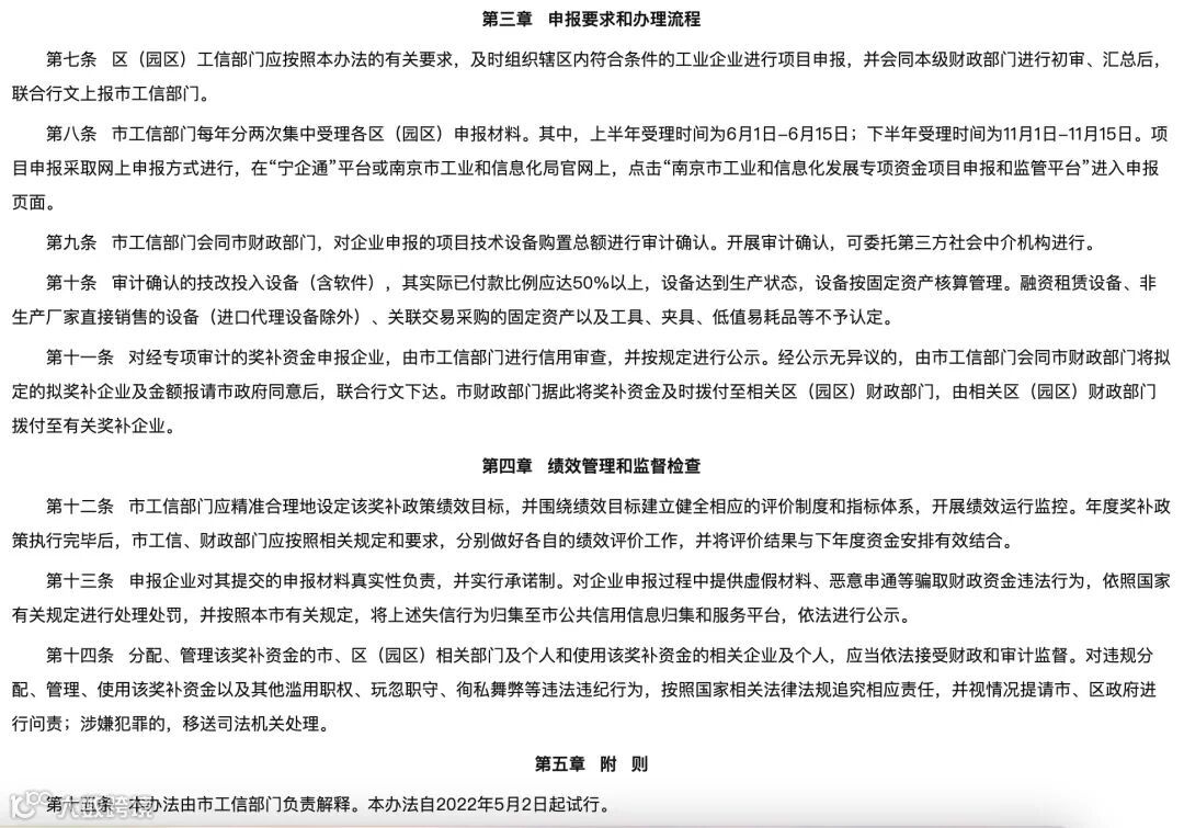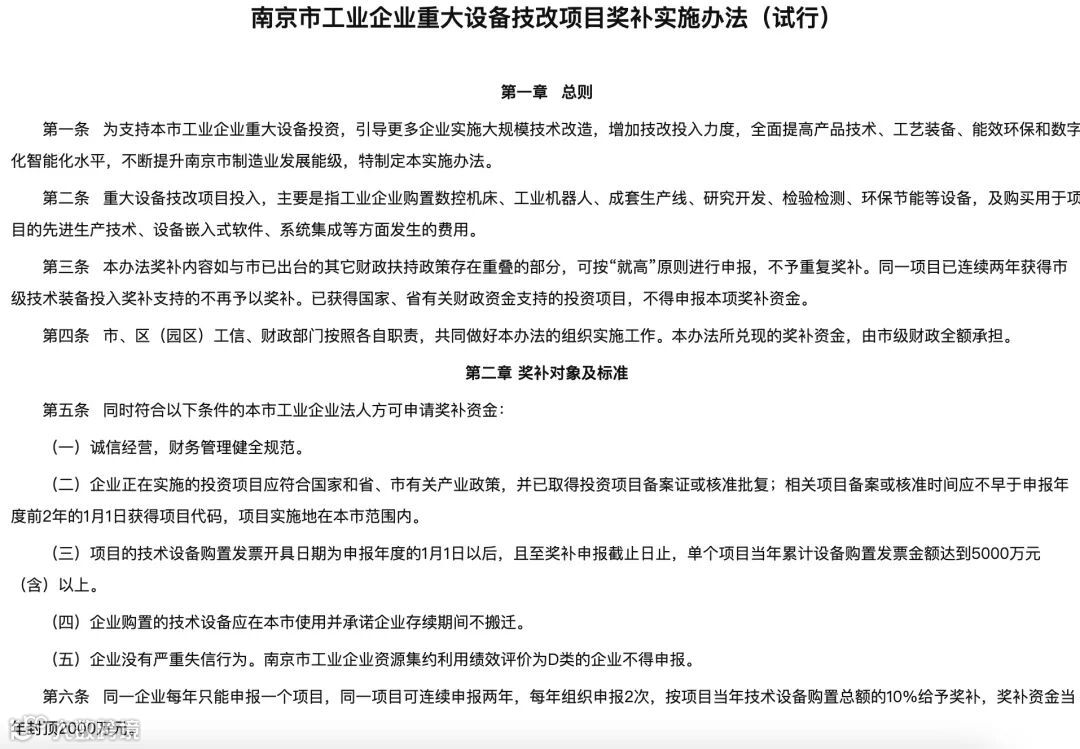 此外,南京市工业和信息化局、南京市财政局于4月22日印发了工业企业重大设备技改项目奖补实施办法(试行)的通知。