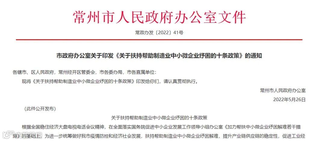 根据全国稳住经济大盘电视电话会议精神,在全面落实国务院促进中小企业发展工作领导小组办公室《加力帮扶中小微企业纾困解难若千措施》的基础上,为进一步统筹做好常州市疫情防控和经济社会发展,扶持帮助制造业中小微企业纾困解难,提升产业链供应链的稳定性,促进工业经济平稳健康发展,特制订如下政策措施(简称“助力中小微纾困新十条〞)。