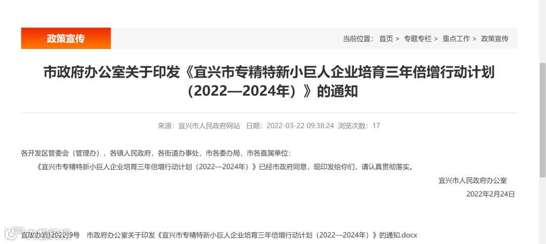 为贯彻落实江苏省、无锡市“百企引航”、“千企升级”专精特新小巨人企业培育工作部署,加速培育更多的国家、省、无锡市级专精特新小巨人企业,推动专精特新小巨人企业量质并举、能级跃升,特制定《宜兴市专精特新小巨人企业培育三年倍增行动计划(2022-2024年)》。