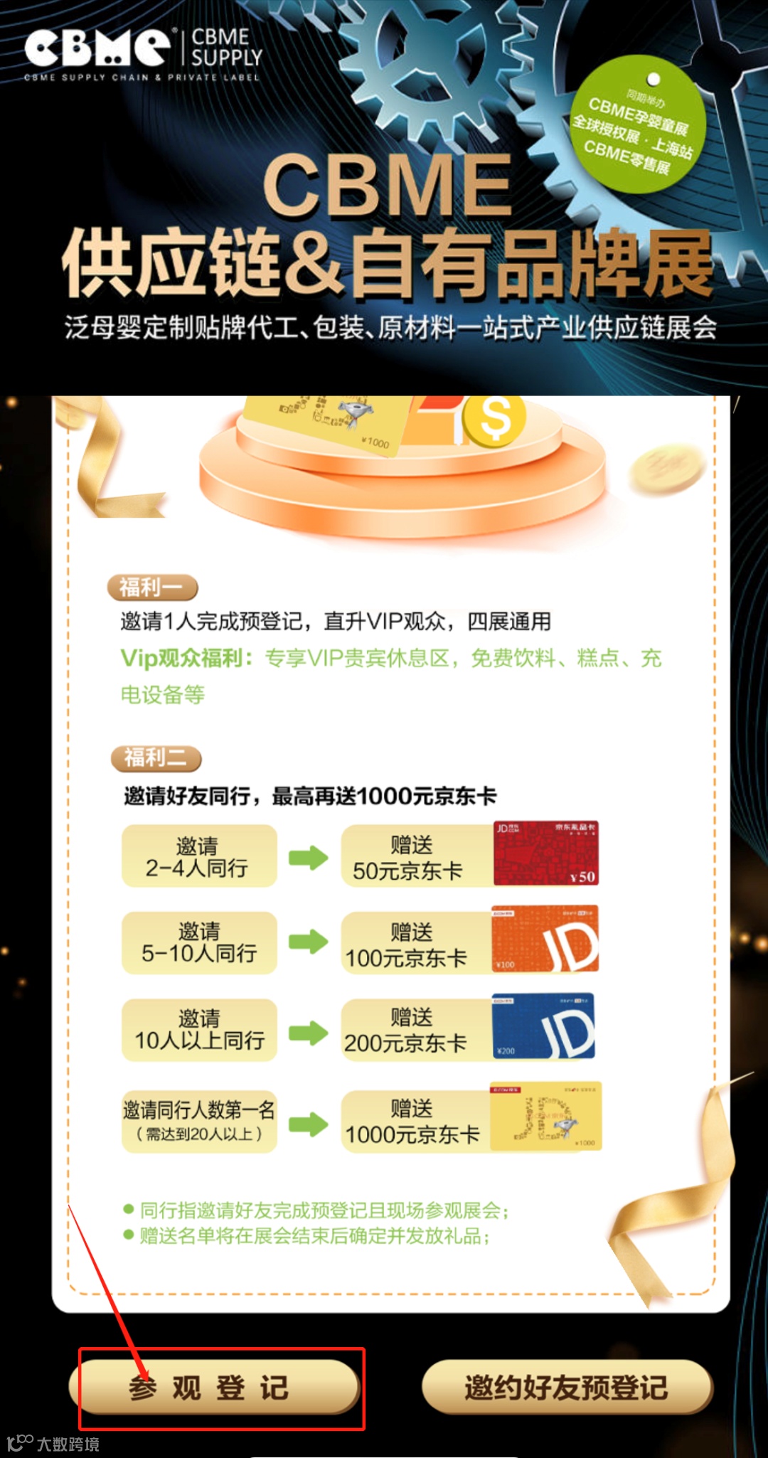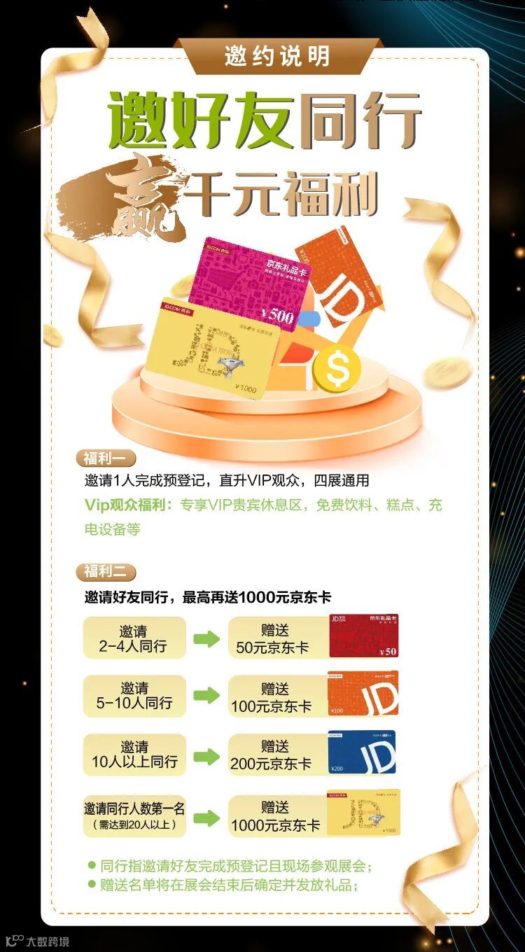 CBME供应链&自有品牌展“邀好友同行,赢千元福利”活动重磅启动,现在免费参与预登记,完成后即可一键转发,邀请好友一同参观展会,参与活动最高可获得价值1000元的京东卡!