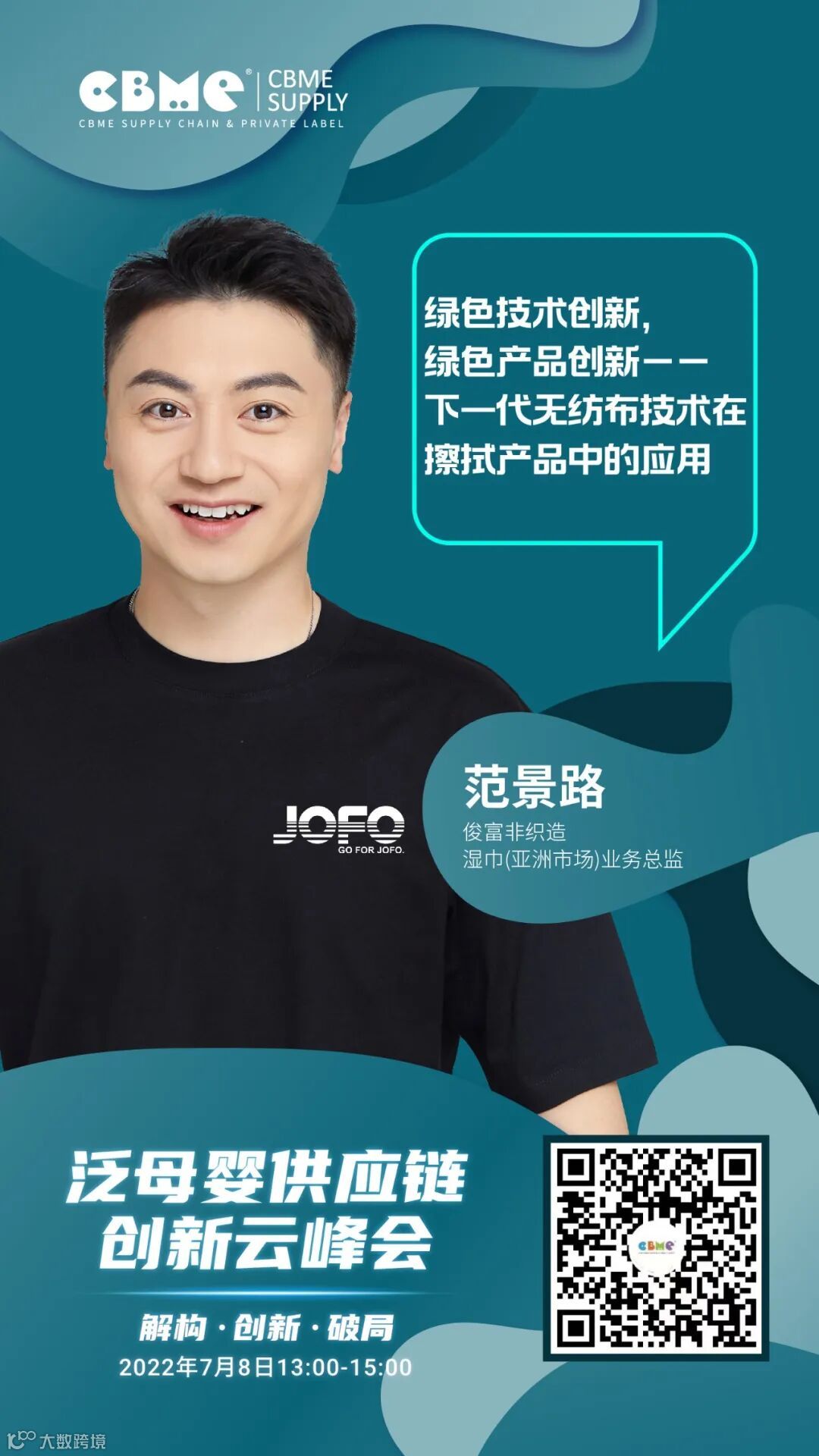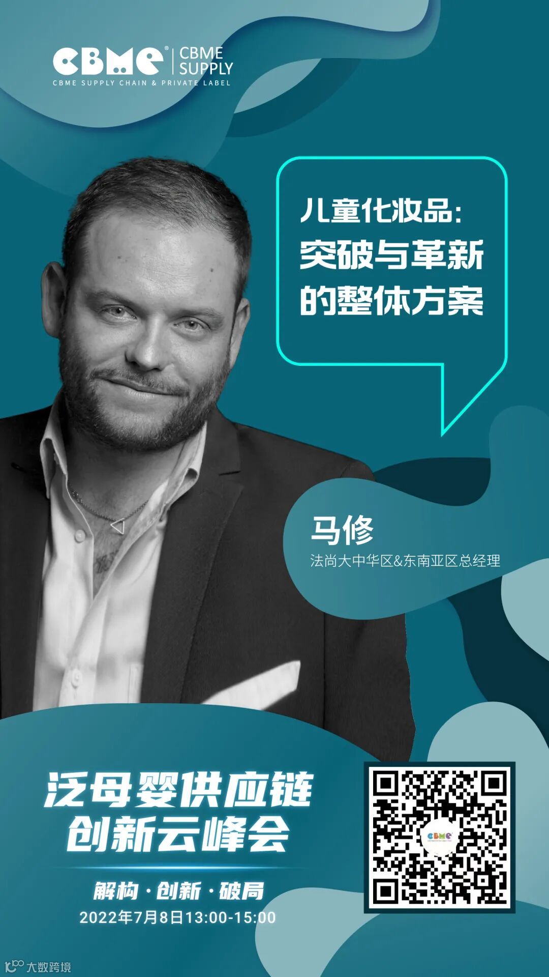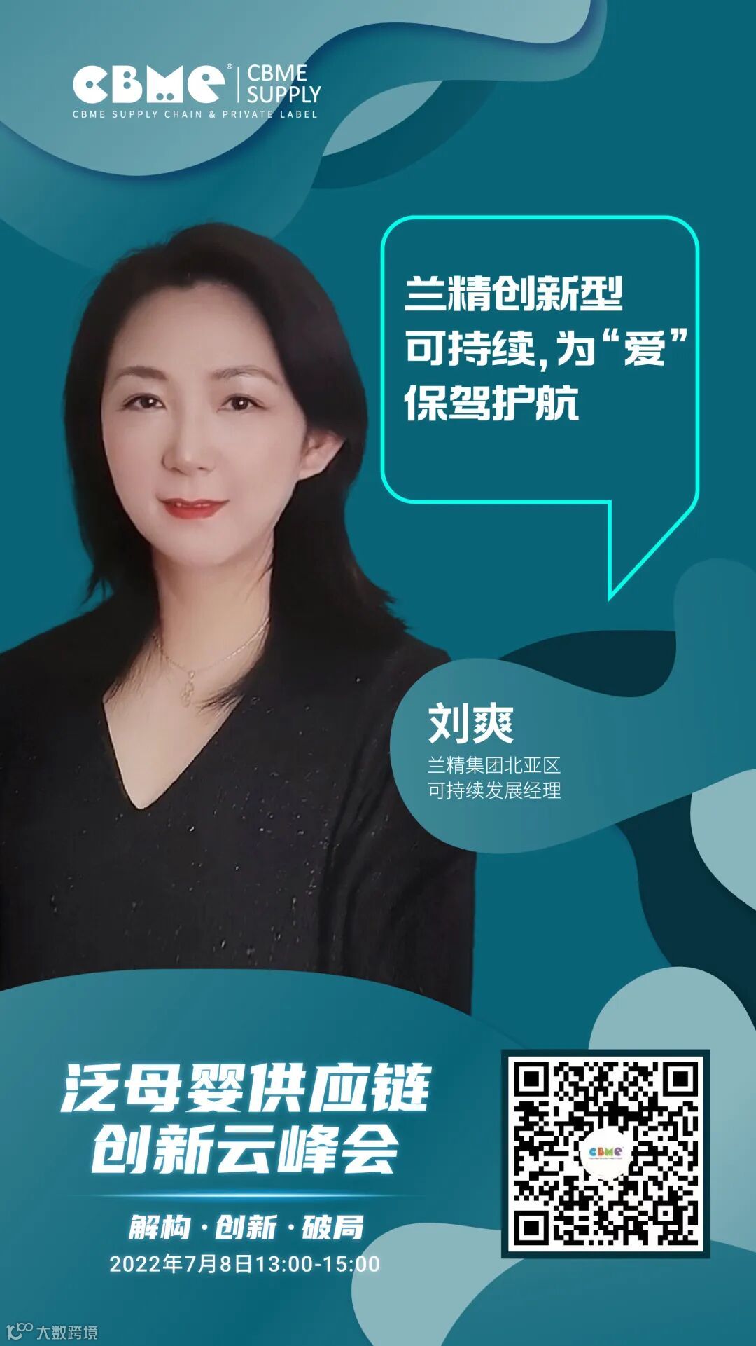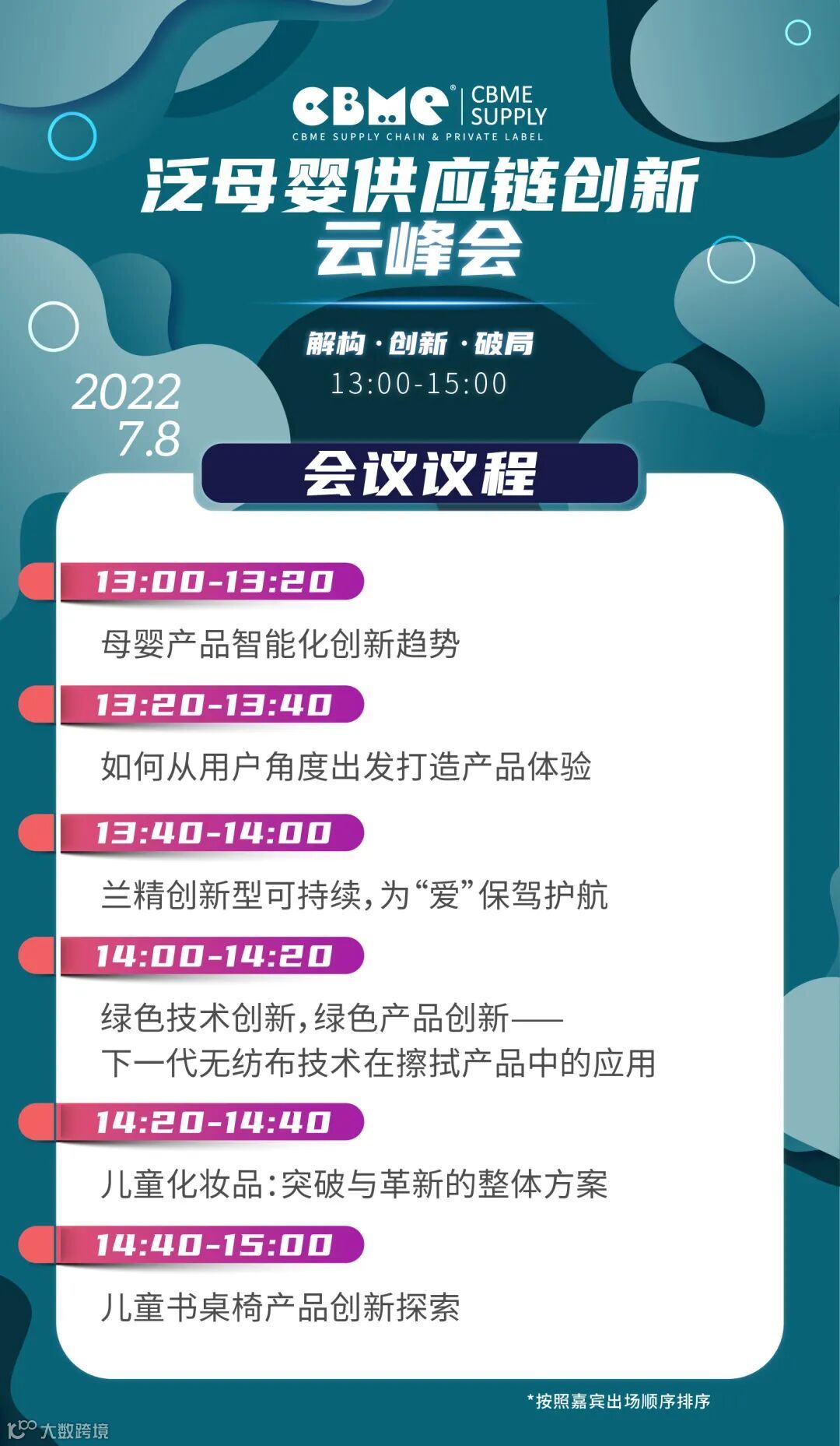2022年7月8日(周五)13:00-15:00,CBME 泛母婴供应链创新云峰会以【解构·创新·破局】为主题,将从供应链的角度,分享产品设计、材料、包装等环节的创新解决方案,助力品牌实现突围,同时为供应链企业提供向品牌商展示自身实力的平台,帮助供应链企业赢取商机。