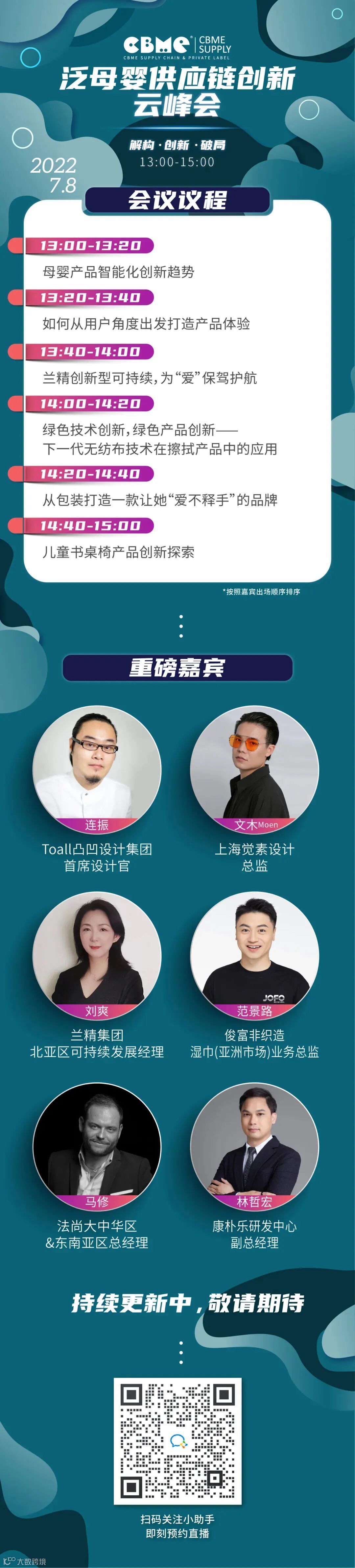 2022年7月8日(周五)13:00-15:00,CBME SUPPLY 泛母婴供应链创新云峰会将从供应链的角度,分享产品设计、材料、包装等环节的创新解决方案,助力品牌实现突围,同时为供应链企业提供向品牌商展示自身实力的平台,帮助供应链企业赢取商机。