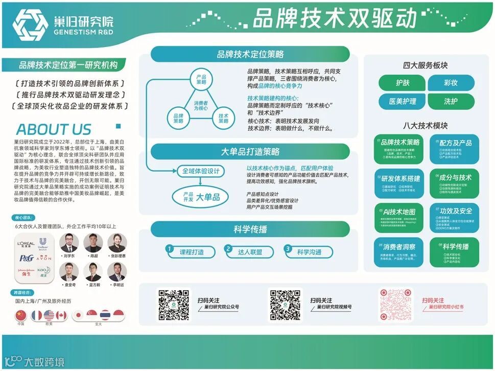 巢归研究院成立于2022年,总部位于上海,由美白抗衰领域科学家刘学东博士领衔。以“品牌技术双驱动”为核心理念,联合全球顶尖科研团队并应用国际标准的研发体系,专注通过技术创新引领的品牌战略,为美妆行业塑造独特的品牌技术价值。旨在提升品牌的竞争力并开辟可持续增长新路径,致力于技术与品牌的完美融合,开创无限可能。巢归研究院通过大单品策略实施的成功案例证明技术与品牌的完美融合能够助推中国美妆品牌崛起 是美妆品牌值得信赖的合作伙伴。