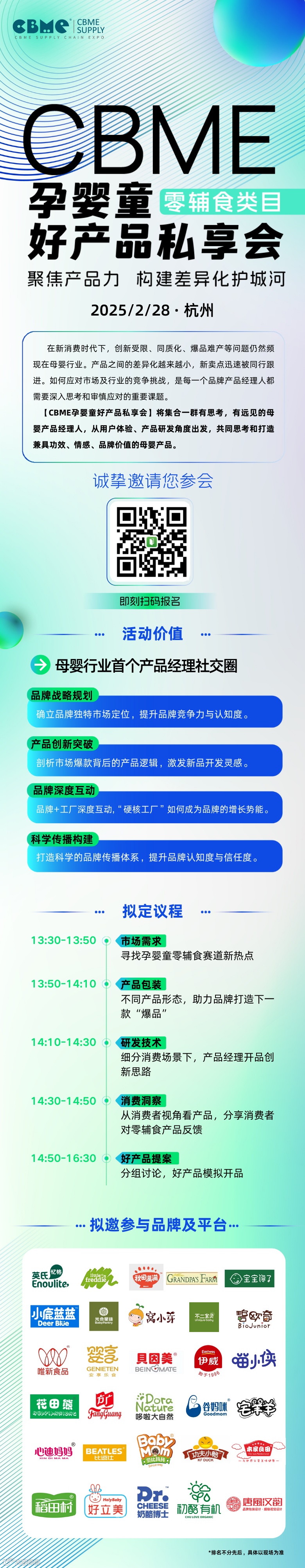 精准把握母婴市场的需求趋势,收集和分析消费者的需求偏好、购买行为等信息,CBME国际孕婴童展将为孕婴童品牌提供产品研发、市场推广提供支持。为了更好地将孕婴童创新概念转化为可落地的解决方案,「2025CBME孕婴童好产品私享会」依然会聚焦供应链升级,携手品牌主理人、医生专家、知名博主及行业领袖,从不同视角审视什么是真正的“婴童好产品”,一众行业力量将面对面共同探讨如何从品牌、技术、内容三个维度出发,塑造符合新时代需求的孕婴童好产品,为品牌的持续健康成长注入不竭动力。并通过深入讨论,洞察背后的基本逻辑。