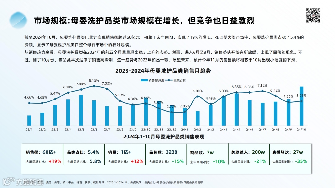 飞瓜首席数据分析专家神婆在私享会上就分享了母婴洗护行业的最新趋势和挑战。她指出,当前市场面临的主要难题包括经济下行压力以及品类内卷化加剧,导致一些品牌选择退出或转型。然而,在这样的环境下,消费者对优质产品的追求并未减少,尤其是宝妈们愿意为孩子提供最优的产品和服务。