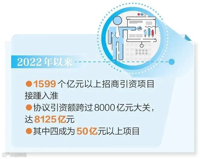 数据显示,2022年以来,1599个亿元以上招商引资项目接踵入淮,协议引资额跨过8000亿元大关,达8125亿元,其中四成为50亿元以上项目。