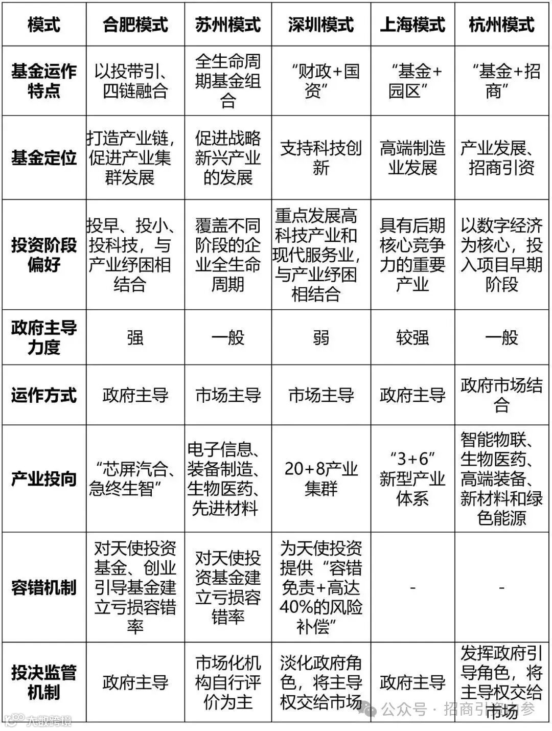 招商引资内参(微信号zsyznc)选取本文整理合肥、苏州、深圳、上海、杭州等地政府投资基金模式特点及相关政策,分析不同运作模式的管理启示,围绕基金“设募投管退”各环节探索提出政府投资基金发展启示。