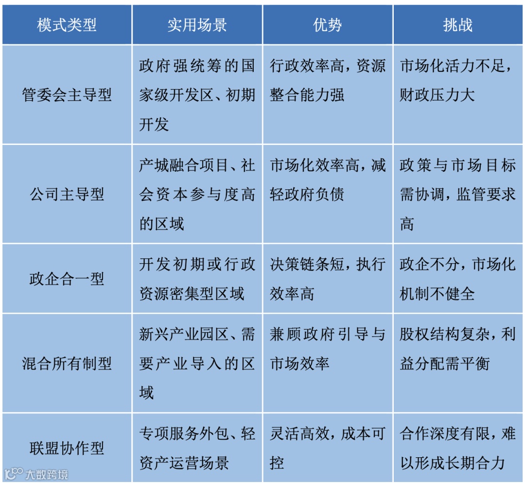 开发初期(0-5年):优先选用管委会主导型或政企合一型,高效完成基建与土地整理。