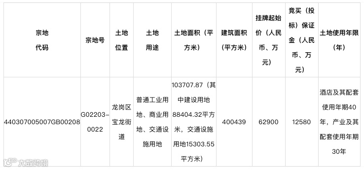 3月21日,深圳市特区建工集团以6.3亿元竞得龙岗宝龙科技城一宗土地,该土地面积10.4万平方米,总建筑面积40万平方米,包括普通工业用地、商业用地、交通设施用地等,综合楼面单价1571元/平方米,计划2023年12月底前建成使用,预计总投资超过25亿元。