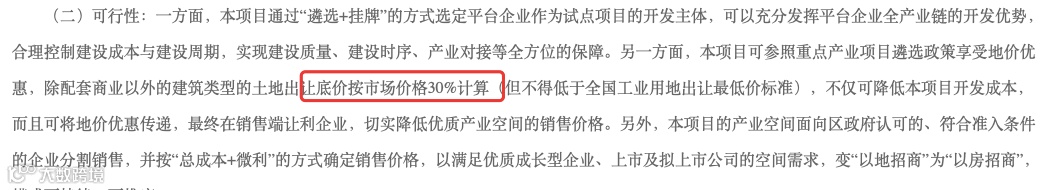 在出让地价上,除配套商业以外的建筑类型的土地出让底价按市场价格30%计算(但不低于全国工业用地出让最低价标准)。