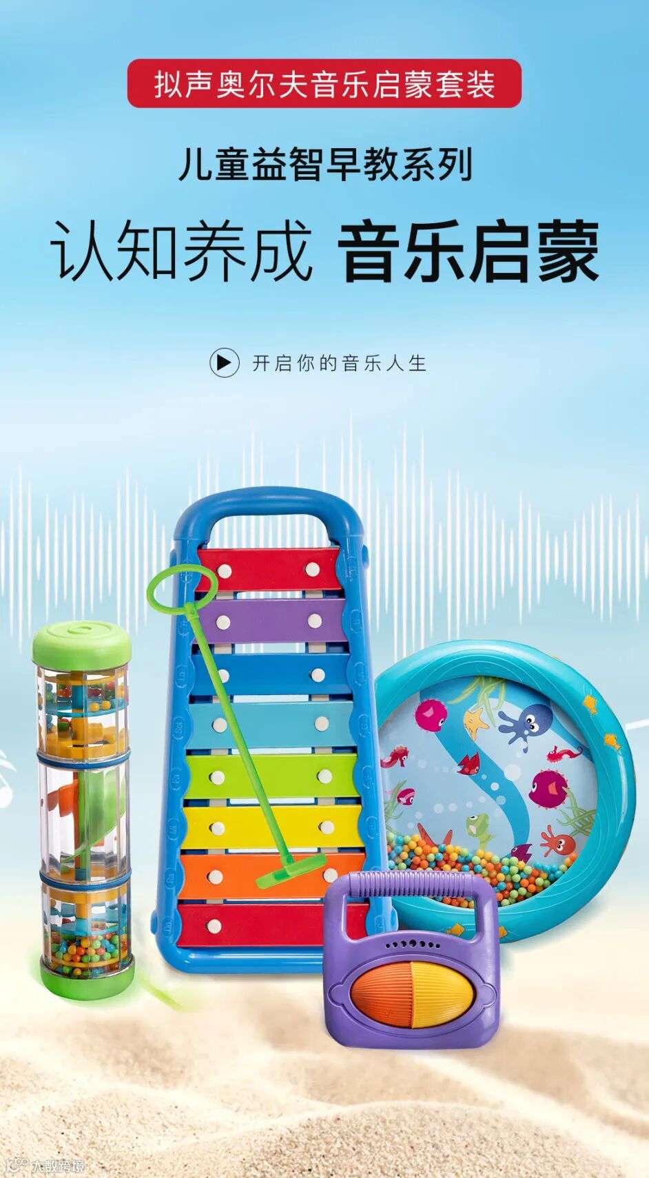 拟声奥尔夫音乐启蒙套装,儿童益智早教系列之一,由安抚雨声筒,八音敲琴,刮刮响和拟声海洋鼓组成。产品均由德国设计,以色列进口,音准达到乐器标准;拟声乐器模仿大自然的声音,让宝宝贴近,感受大自然,在音乐启蒙教育中起到重要作用。
