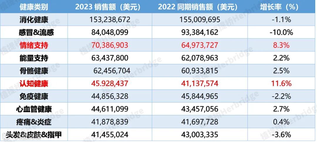 在天然强化渠道中,和2022年相比睡眠健康已经不在Top10健康类别,新进入的玩家是“免疫健康”,虽然免疫健康市场销售额出现下滑,但销售额达4400万美元,超过睡眠健康。同时,增长比较明显的健康类别分别是情绪支持和认知健康,市场增幅分别为8.3%和11.6%。