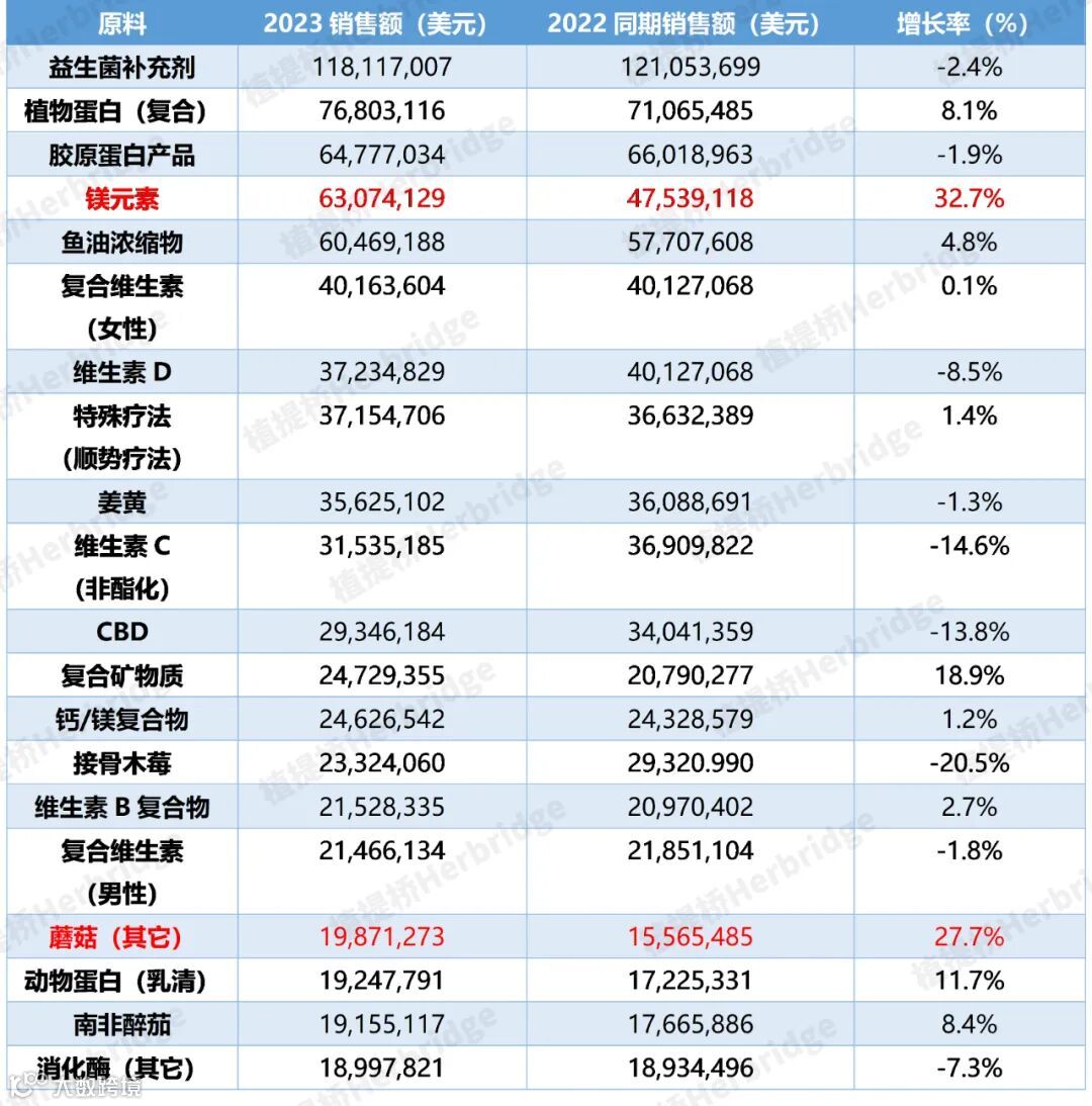 以下是2023年天然强化渠道Top 20原料的具体销售数据: