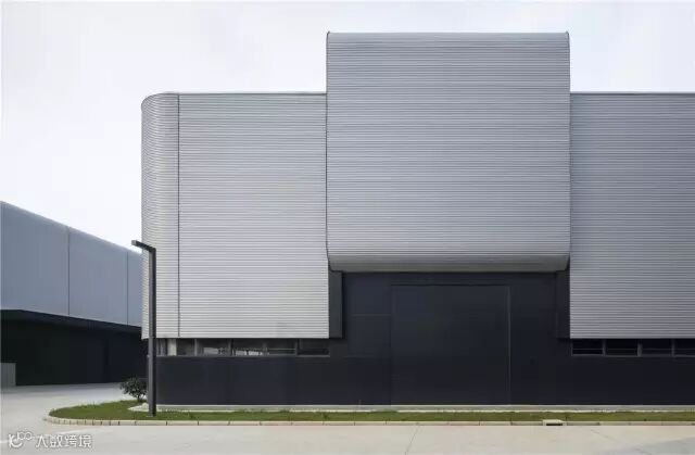 弧线的建筑转角刻画了新建厂房的整体形象,同时令外部道路交通引导更加通畅。外立面采用银灰色小波纹钢板,延续了弧线的设计概念。入口通道和卸货区域从立面上突出抬起,波纹钢板随弧形造型延伸到屋顶。考虑到临港靠海的风雨天气因素,抬起的下部向外自然延伸形成雨棚,同时满足了立面统一和实际需求。