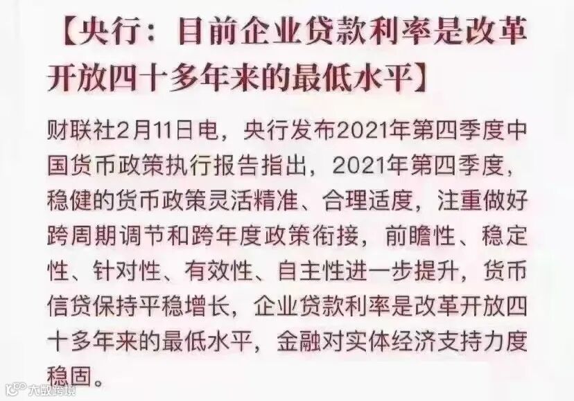 导读:【中国央行:目前企业贷款利率是改革开放四十多年来的最低水平】中国央行发布2021年第四季度中国货币政策执行报