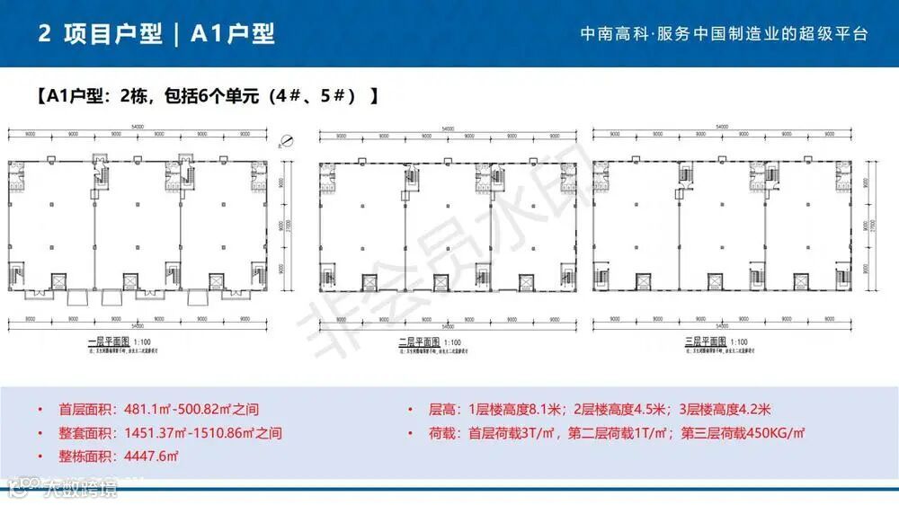 首层层高8.1米,二层4.5米,三层4.2米 6层厂房可分层出售 1100平起售 价格好谈