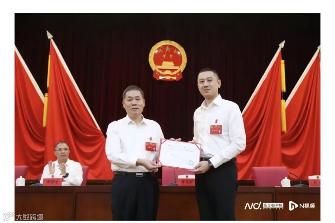 2025年4月,长安镇党委书记叶孔新(左)为新当选的镇长莫伟(右)颁发证书。图源:欢乐长安