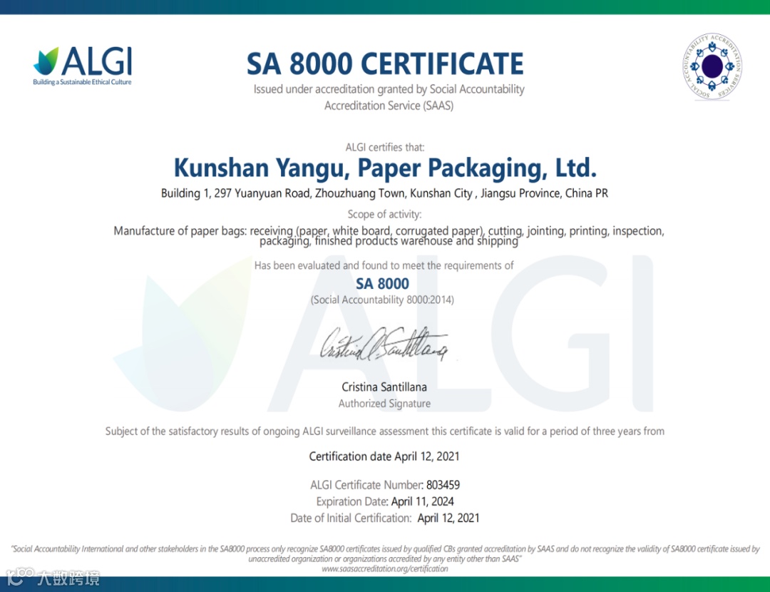 企业通过了SA 8000国际管理体系认证、ISO 9001 体系认证等国际认证。