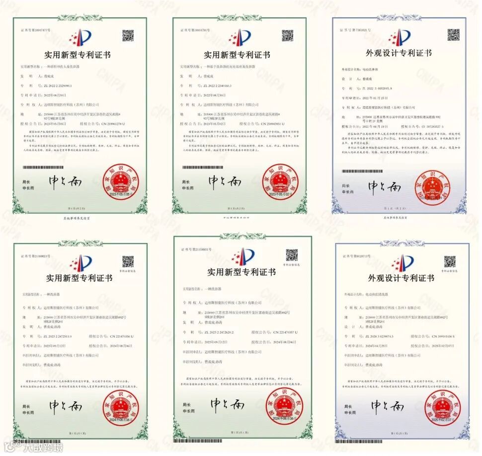 手握 21 项专利技术(含 3 项发明专利)及 7 项医疗器械注册证,多款电动鼻腔清洗器斩获外观设计专利,核心技术如洗鼻器结构创新、充电基座设计等均获得国家认可,用专利实力保障产品品质。