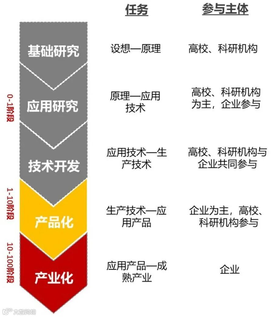 从科技创新到产业转化,涉及基础研究、应用研究、技术开发、产品化和产业化的过程,可以分为0到1、从1到10和从10到100三个阶段。0-1阶段:科学家级别科研人员主导,依托成体系的研发试验装置,研发周期长,成功率低,长期资金投入,基本无收益。1-10阶段:高水平科研人员主导,依托成体系的试验装置,有较高失败率,需要持续资金投入。10-100阶段:技术人员主导,依托检验检测等配套服务设施,量产收益可观,受资本的青睐。