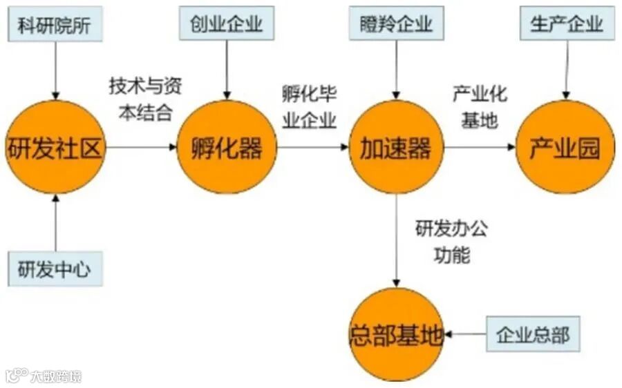 产业孵化要考虑为企业的不同发展阶段提供空间承载和服务赋能,在空间承载上有研发社区、孵化器、加速器、产业园和总部基地等等,在服务赋能上除了公共实验室、融资、咨询、人才、财务、法律等服务,还有概念验证中心、共享制造中心、场景实验室等新兴的服务平台。