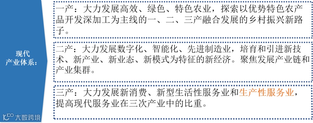 现代产业体系,是指现代元素比较显著的产业构成,主要指第一、第二与第三产业的构成。不同经济发展水平的国家现代产业构成差异比较大,所以现代产业体系涵义不同。在经济发达国家,现代产业体系主要指现代服务业发展比较充分的产业构成,一般情况下现代服务业要占其GDP的70%左右。