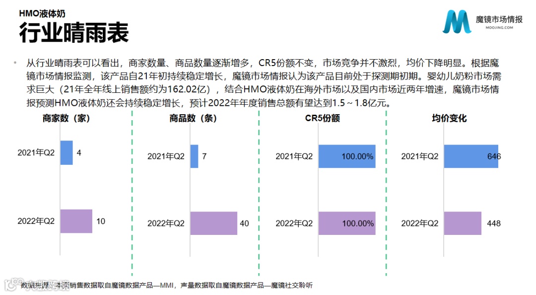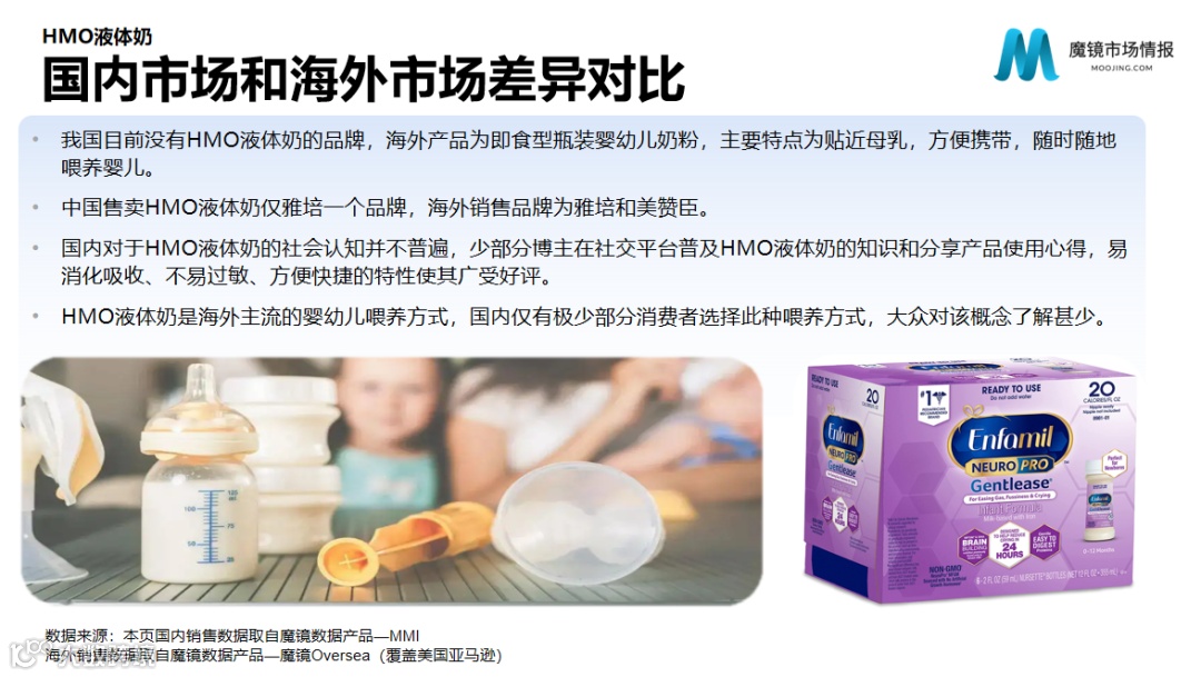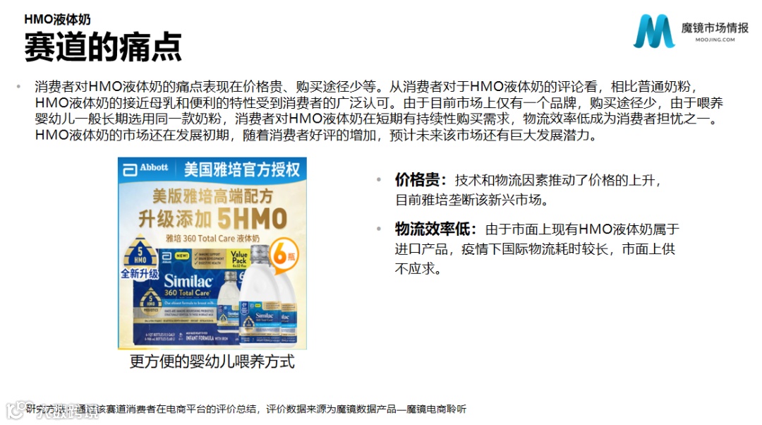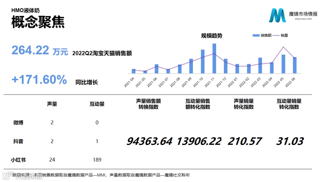 赛道解读:HMO液体奶适用于婴幼儿,相比于奶粉,液体奶省去了冲泡的麻烦,可以即开即饮,适合外出携带及新手爸妈带娃,而添加了HMO成分的液体奶更接近母乳、能给宝宝提供多重防护,目前国内市场上HMO液体奶较少,以雅培为主,但受制于物流及价格昂贵的原因,消费者对其认知度和接受度并不高,在海外,HMO液体奶已成为主流的婴幼儿喂养方式,魔镜认为该产品目前处于探测期初期,随着更多的消费普及和营销宣传,HMO液体奶市场规模将会持续增长,2022年度整体销售总额有望达到1.5-1.8亿元。
