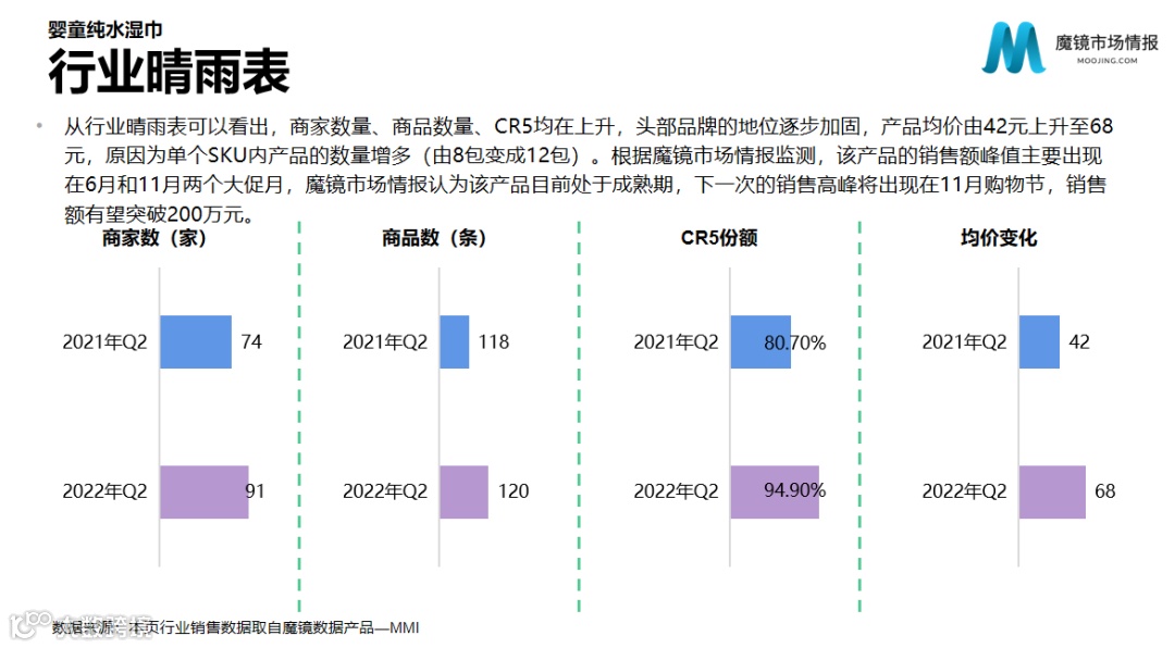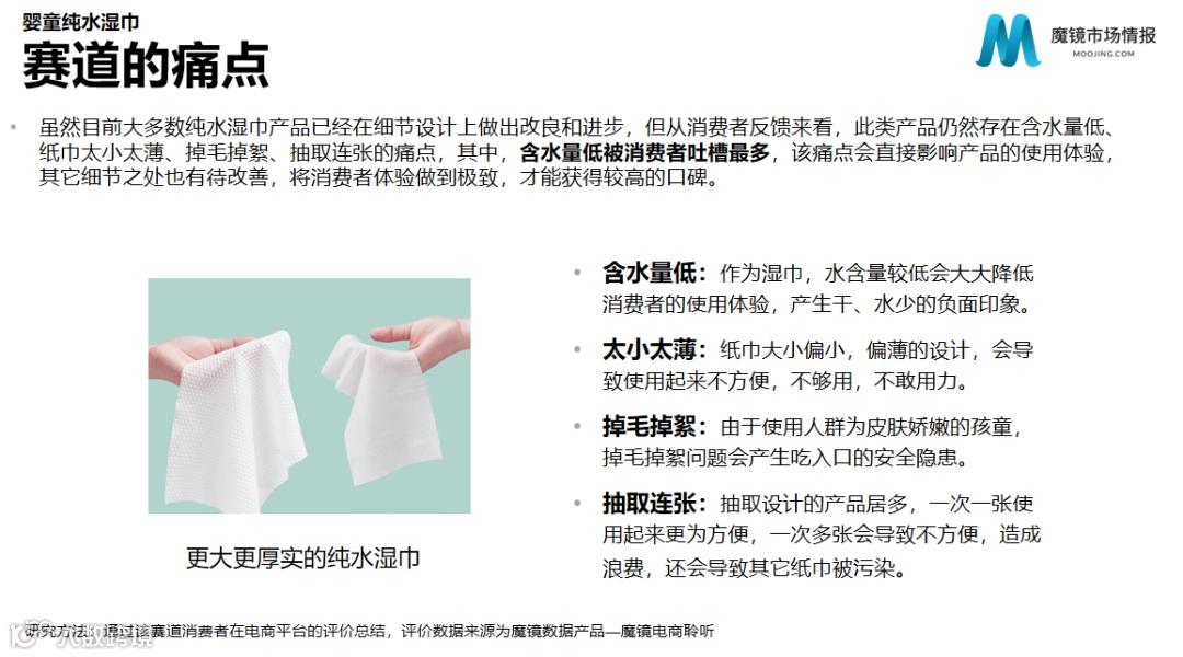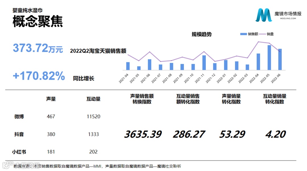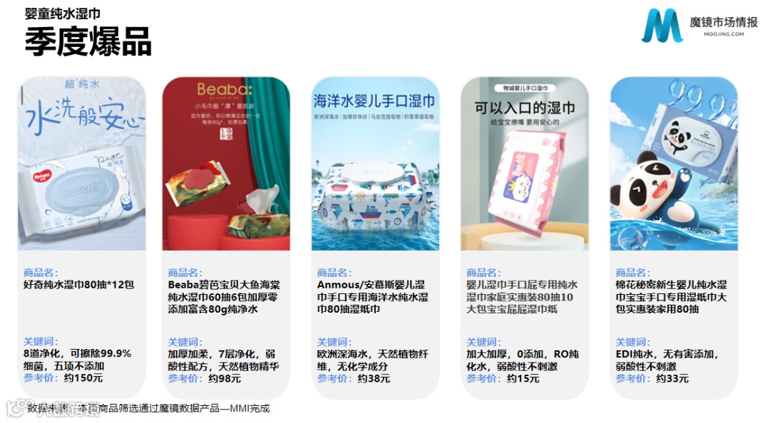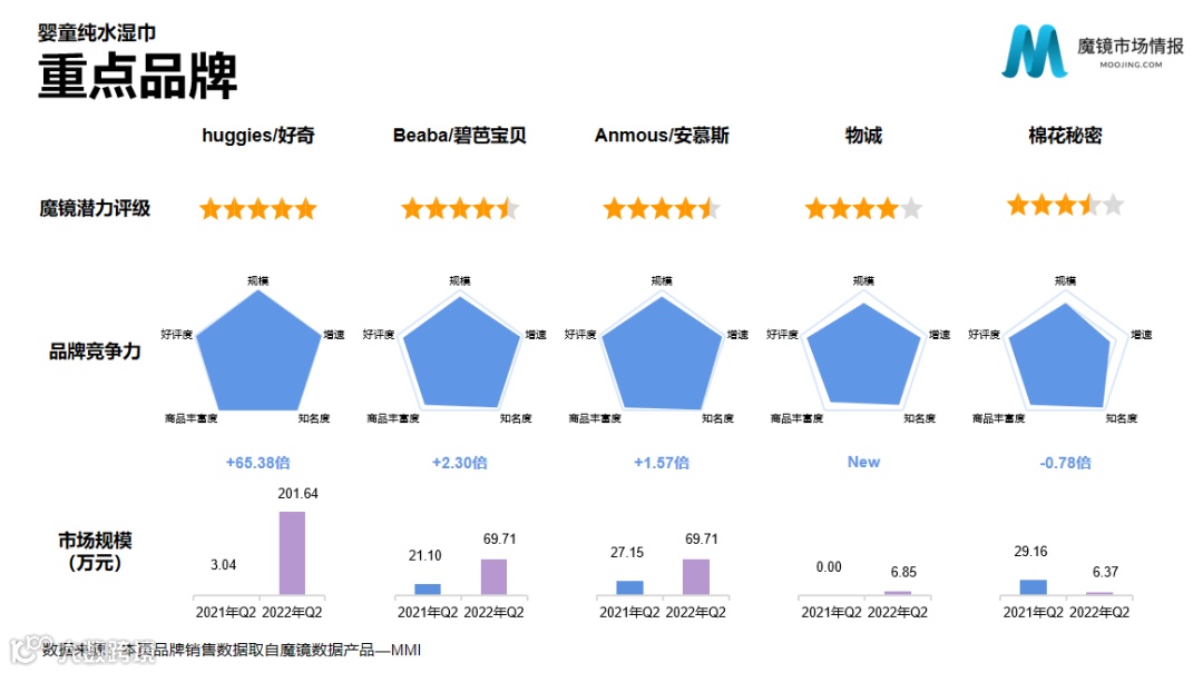 2.婴童纯水湿巾:婴童纯水湿巾2022年Q2其淘系平台的销售额同比增长170.82%,目前婴童纯水湿巾市场的入场品牌并不多,竞争不算激烈,但产品本身还存在着水分不足、掉絮、连抽等痛点亟待解决。