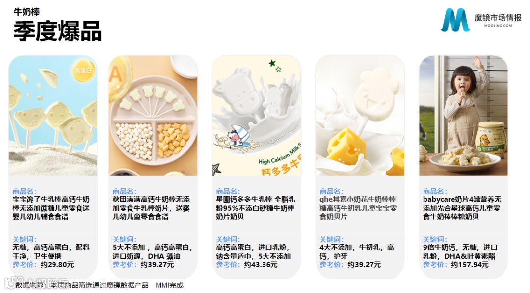 4.牛奶棒:牛奶棒在2022年Q2销售额涨势迅猛,销售额同比上涨了25倍+,牛奶棒作为浓缩的牛奶,高钙、成分简单无添加等特点深深抓住了消费者对于幼儿零食的需求。