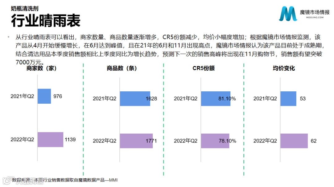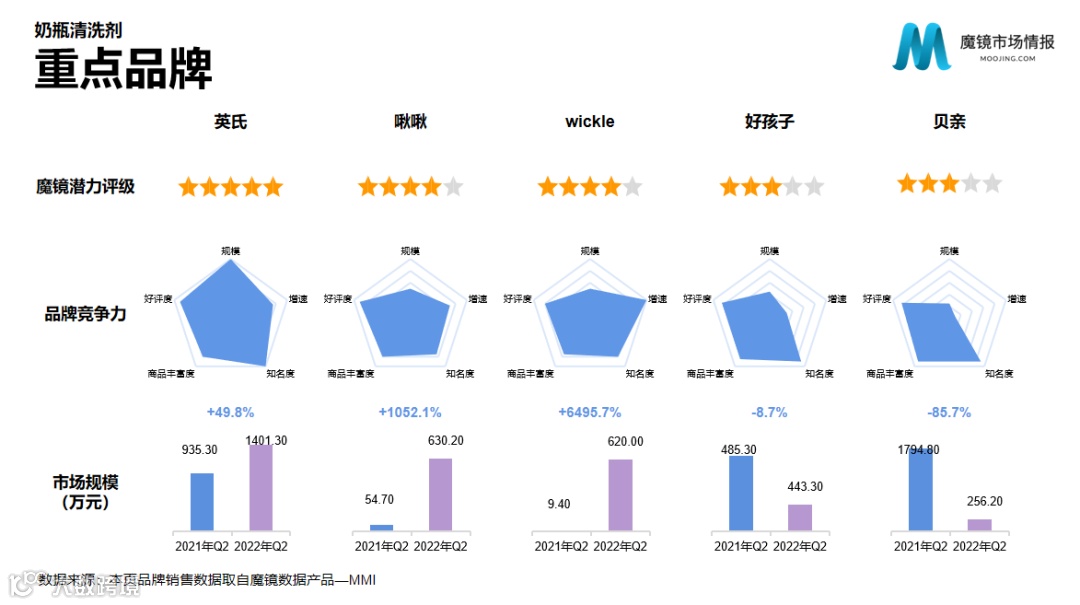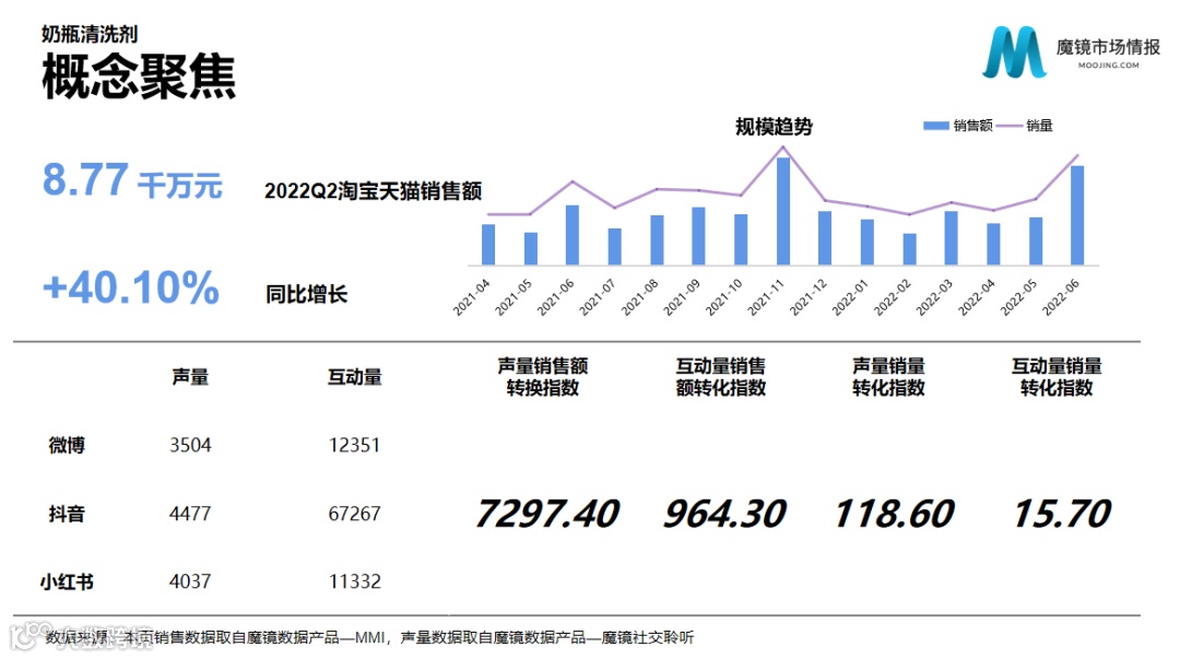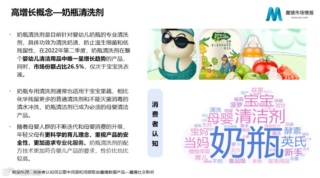 1.奶瓶清洗剂:2022年Q2,奶瓶清洗剂在淘系平台的销售额同比增长了40%,针对婴童群体的奶瓶清洗剂以其清洁专业性和安全性受到消费者认可,目前市场上的奶瓶清洗剂绝大部分都为一瓶多效清洁,洗的“更净更安全”是产品提升方向。