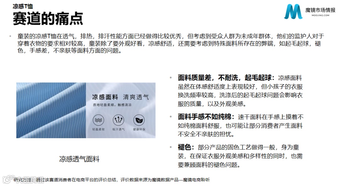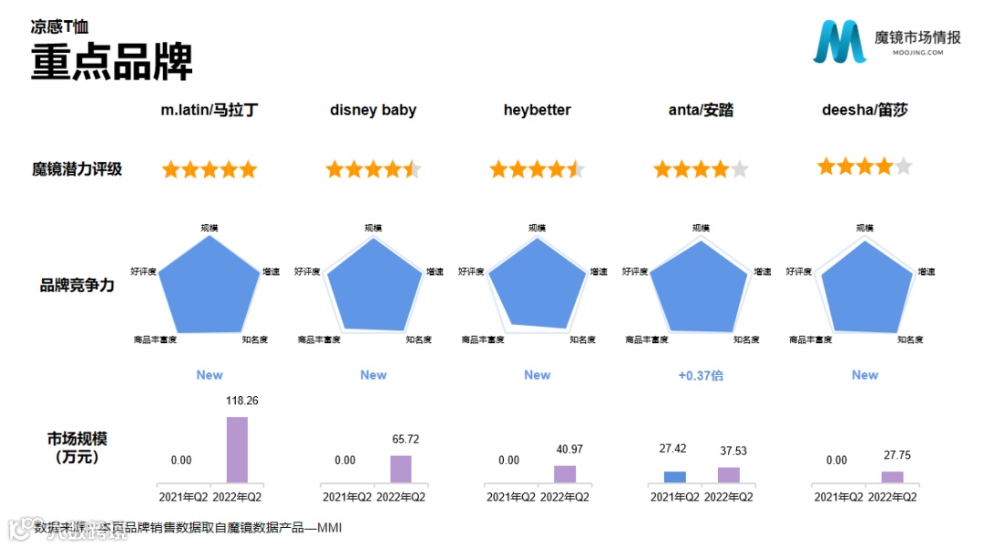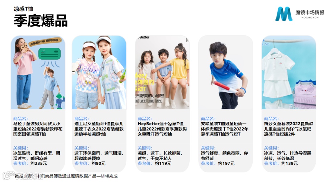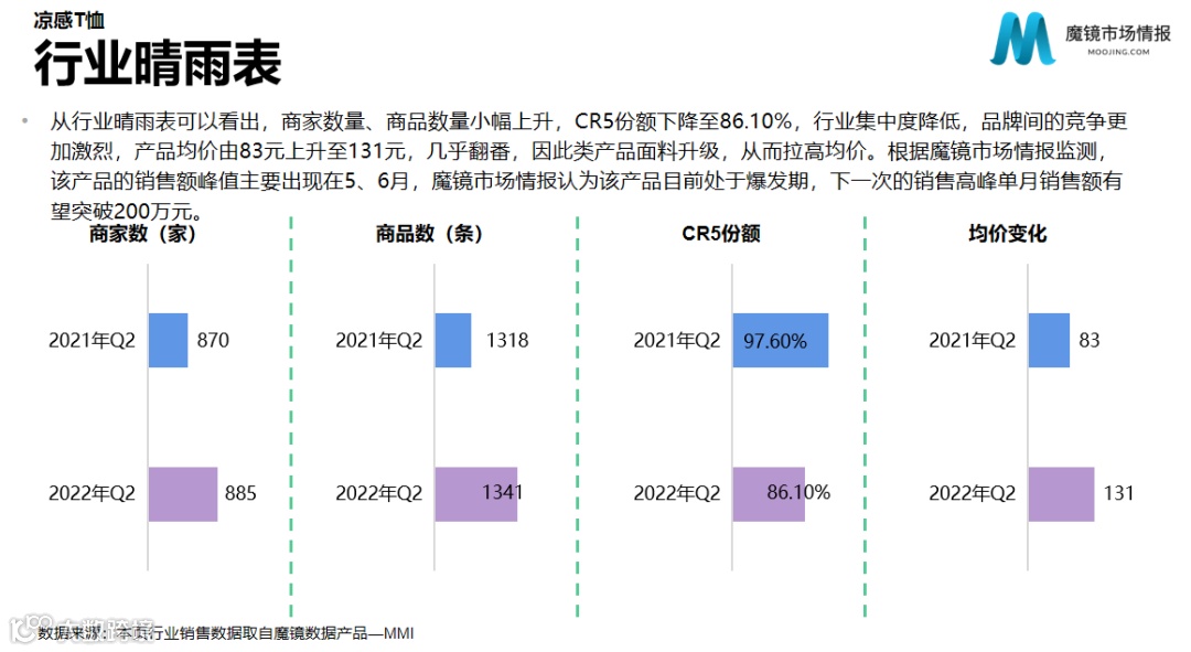 赛道解读:今年起,受到疫情影响,经济下行,童装行业整体表现不佳,1-7月淘系销售额同比下滑9.8%,但魔镜监测到,今年5月,主打“凉感舒适”的儿童凉感T恤销售额大增,2022年Q2,凉感T恤在淘系的销售额同比增长364.97%,儿童活泼好动、肌肤较娇嫩敏感的特性给了凉感T恤很大的市场发展空间,同时也对其面料提出了更高的要求,与普通T恤相比,凉感T恤的透气、排湿、排热性能较好,能让小朋友在开心玩耍的同时,拥有比较舒适的穿着体感,另外,在面料的成分上,0化学物质、更安全、抑菌等标签,也可以加强消费者的购买决策,2022年Q2,凉感T恤的CR5已由去年的97.6%降至86.1%,我们看到,随着更多的品牌入局,市场竞争也会越来越激烈,但提升品质、安全性依然是品牌得到消费者认可最重要的原因。