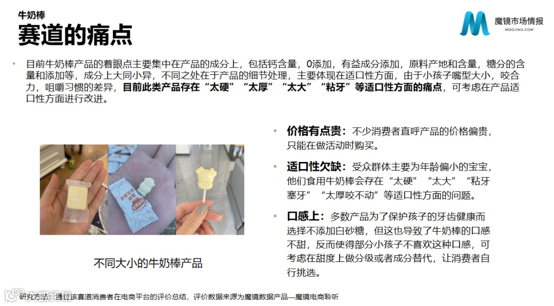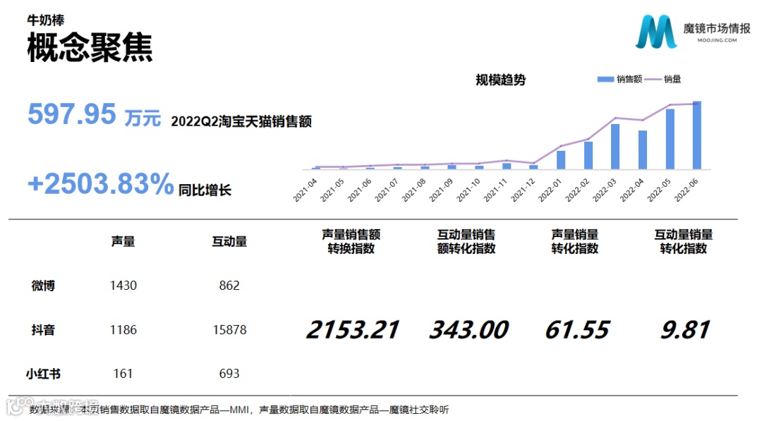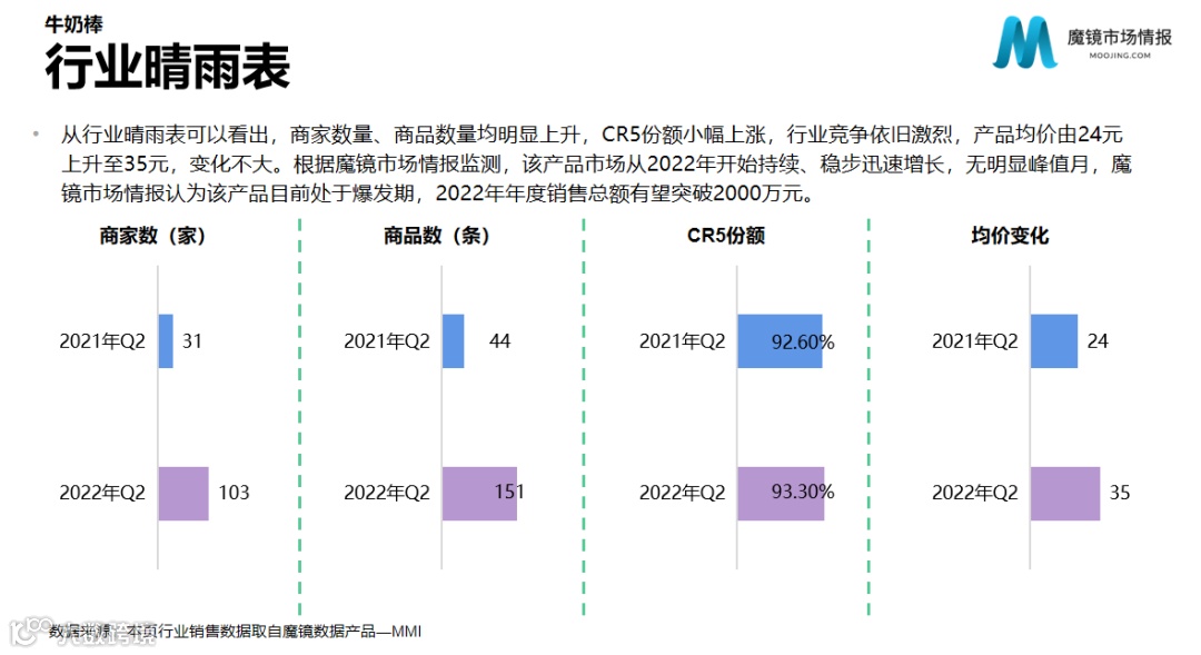 赛道解读:疫情影响下消费疲软,但宝宝零食赛道一直表现亮眼,2022年Q2宝宝零食赛道在淘系销售额同比上涨了55%。魔镜监测到,作为儿童奶片的新形态,牛奶棒在2022年Q2销售额涨势迅猛,销售额同比上涨了25倍+,牛奶棒作为浓缩的牛奶,高钙、成分简单无添加等特点深深抓住了消费者对于幼儿零食的需求,儿童零食赛道的新锐品牌宝宝馋了、秋田满满、星圃、其嘉、babycare纷纷布局该赛道,目前行业CR5超90%,预测未来将会有大批宝宝零食相关品牌入局,竞争逐渐激烈,魔镜市场情报认为,该产品目前处于爆发期,2022年线上年度销售总额有望突破2000万。