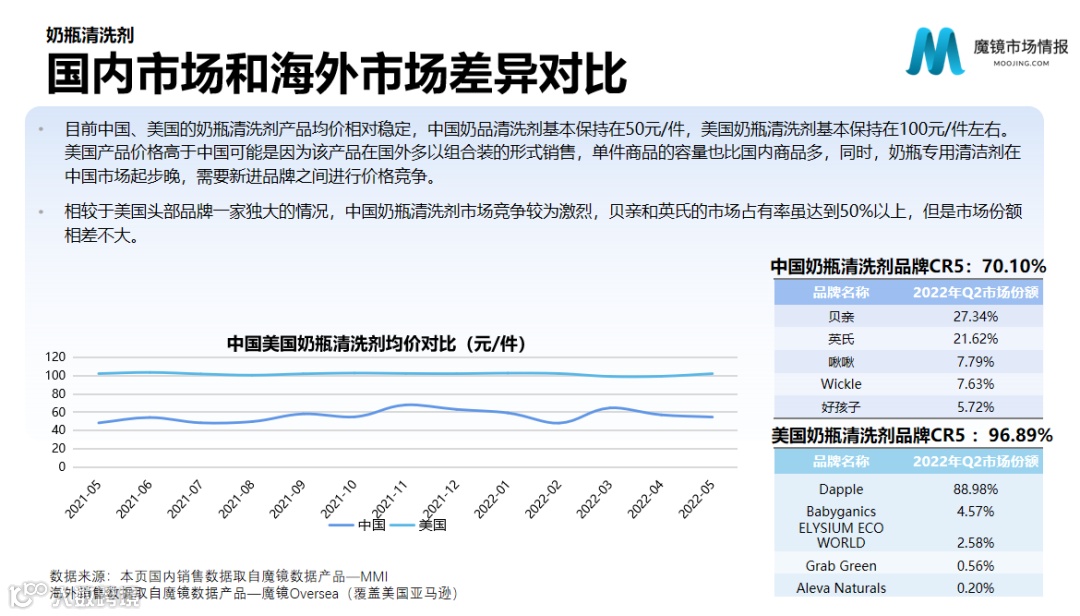 赛道解读:在精细化喂养的大趋势下,宝爸宝妈们对婴童用品的安全性提出了更高的要求,据比达咨询调研显示,有71.5%的Z世代孕妈在选购母婴用品时最关注产品的安全,相比于普通清洁剂的化学残留和清水冲洗不能消毒灭菌,奶瓶清洁剂凭借其清洁专业性、安全性在2022年Q2销售额同比增长40%。专用奶瓶清洗剂在中国起步较晚,目前贝亲和英氏两大品牌共占据约50%的市场份额,市场集中度较高,目前市场上的奶瓶清洗剂绝大部分都为一瓶多效清洁,除奶瓶外,还可清洗果蔬、儿童玩具等,洗的“更净更安全”是产品提升方向。