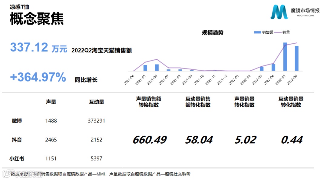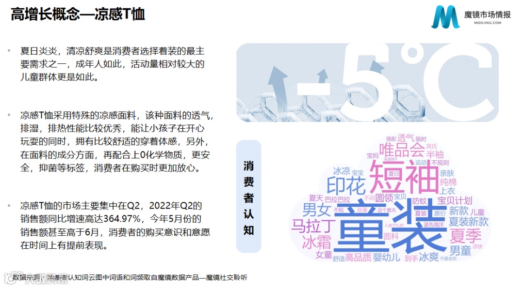 3.凉感T恤: 2022年Q2,凉感T恤在淘系的销售额同比增长364.97%,在面料的成分上,0化学物质、更安全、抑菌等标签可以加强消费者的购买决策。