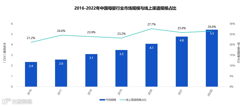 今年两会期间,“鼓励生育”的话题尤为受关注,“构建生育友好型社会”也被政策大力倡导,当下虽然中国人口出生率在不断下降,但得益于“三孩”政策落地及母婴群体消费能力的不断提升,母婴市场规模仍然在持续扩大,据比达咨询发布的《2021年度中国互联网母婴市场研究报告》显示,从2016年起,母婴行业的市场规模在不断攀升,2021年规模达到4.8万亿元,随着消费升级,育儿成本上升,伴随着线上直播带货的风口,预计2022年规模将达到5.5万亿。2021年母婴线上渠道规模占比达25.9%,疫情加速模糊了线上线下的消费界限,促使品牌主加速布局线上渠道,不断挖掘母婴消费的增量,预计这一占比将不断增加,2022年达到26.6%,整体来看,国内母婴赛道发展利好。