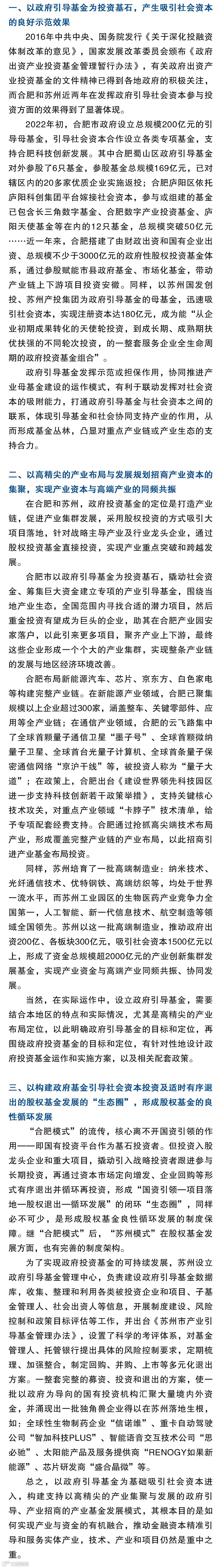 2021-2022年近两年来,人民币募资最热闹的两个地方是合肥和苏州,合肥明确提出了“以政府基金为主导、以产业招商为导向”的投资方式,称之为独具特色的“合肥模式”。继合肥后提出“服务企业全生命周期的政府投资基金”的“苏州模式”,政府引导基金的助力效果卓有成效。梳理总结“合肥模式”和“苏州模式”,对助力和丰富上海股权投资市场,更好服务上海高新技术产业和创新创业的高质量发展具有重要的意义。