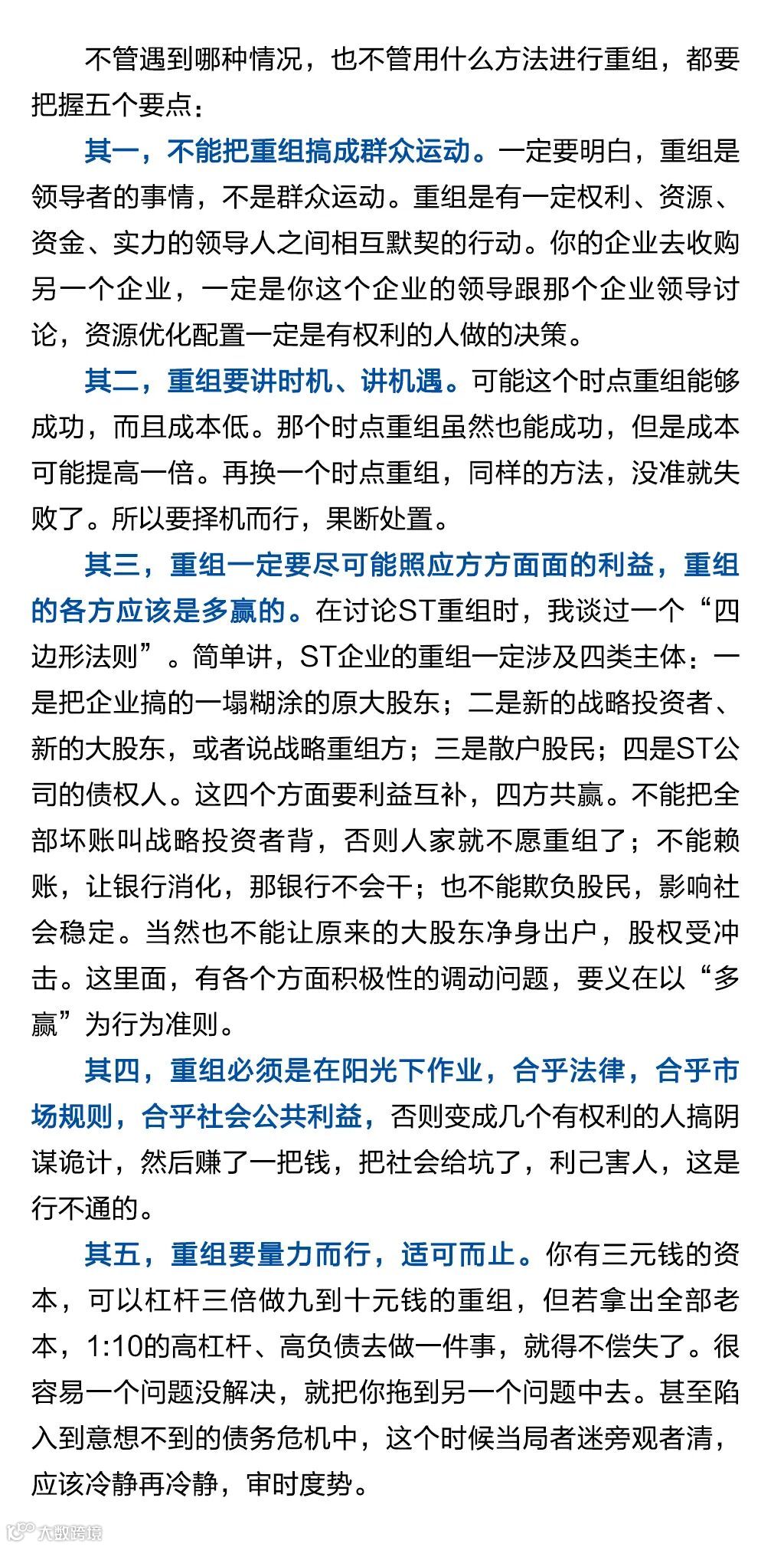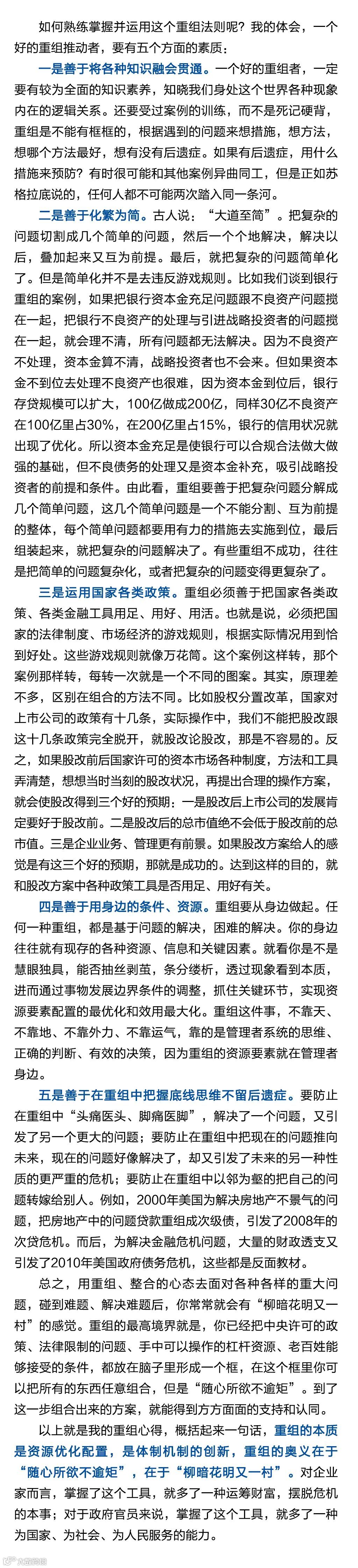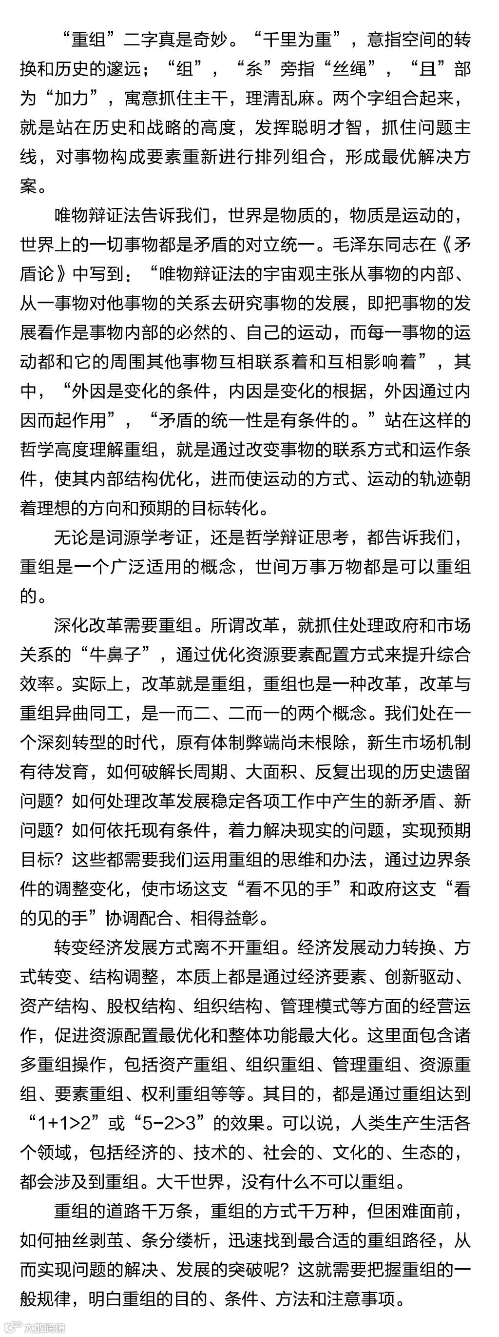 黄奇帆曾担任重庆市长,他每次公开演讲以及关于招商引资的文章都能在业内引发强烈反响。11月11日,在上海联交所举办的“2022世界并购大会”上,黄奇帆发表主题演讲。他表示要认真体会“充分发挥市场在资源配置中的决定性作用,更好发挥政府作用”的内涵。事实上,市场经济发育的过程就是并购重组不断发生的过程。当前,全球经济风云变幻,中国经济负重前行,无论是宏观层面的深化改革、高质量发展,还是微观层面的企业经营、产业发展,都有巨大的重组空间。十分值得大家细细琢磨。