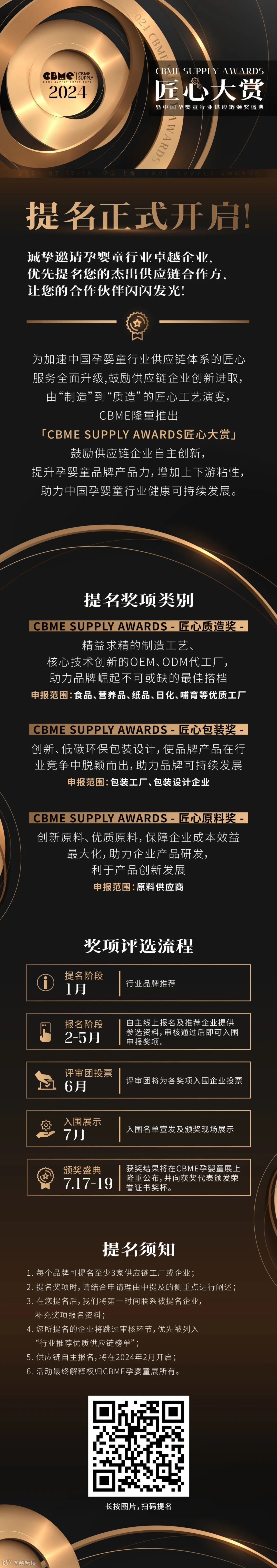 CBME SUPPLY AWARDS 匠心大赏提名已正式开启,该奖项旨在鼓励供应链企业自主创新,助力中国孕婴童行业健康可持续发展。