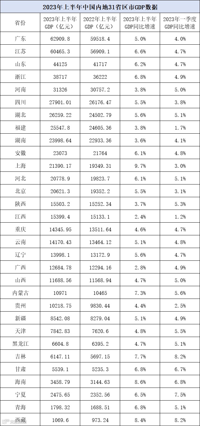 31省份上半年GDP数据已全部出炉。总量上,广东、江苏、山东稳坐前三,其中,广东、江苏上半年突破6万亿;增速方面,17个省份超过或持平全国水平(5.5%),14省份增速低于全国。