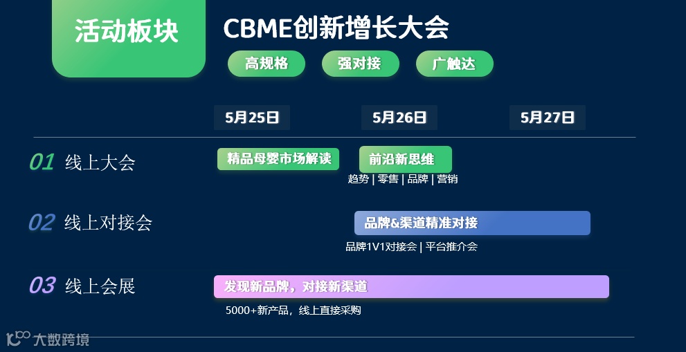 2022年7月6-8日,CBME将首次举办线上孕婴童展!届时我们会以“CBME云采宝”为载体,举办线上云展会系列活动。CBME将整合114万+庞大数据库资源及200+行业专业社群,依托10万+行业活跃买家的专业平台CBME云采宝,通过线上「主题峰会直播+小程序展商展示对接+一对一配对会」相结合的方式,助力产业上下游高效对接。