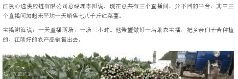 《日销七八千斤!直播带江陵红菜薹走全国》,报道江陵返乡助农直播团队把直播间搬到合作社和田间地头,用一部部手机为乡亲们打开了“云端市场”。