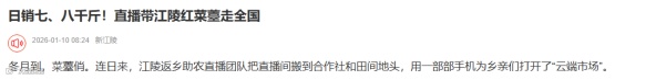 ◎1月12日,《央视新闻》《长江云》《极目新闻》《荆州日报》客户端报道江陵红菜薹直播(稿件来源:县融媒体中心、郝穴镇)