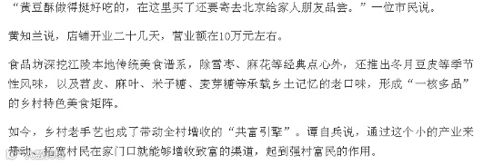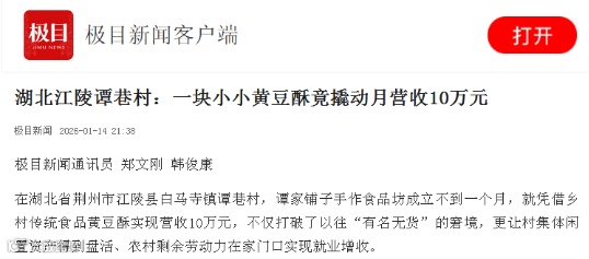 《湖北江陵谭巷村:一块小小黄豆酥竟撬动月营收10万元》,报道江陵白马寺镇谭巷村,谭家铺子手作食品坊成立不到一个月,就凭借乡村传统食品黄豆酥实现营收10万元,不仅打破了以往“有名无货”的窘境,更让村集体闲置资产得到盘活、农村剩余劳动力在家门口实现就业增收。