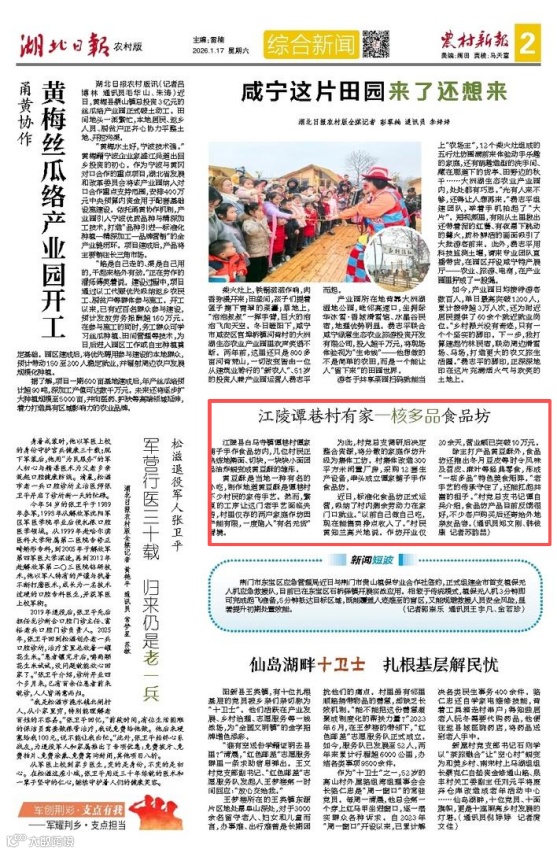 ◎1月14日,《极目新闻》《荆州日报》客户端、《农村新报》纸媒报道江陵特色食品黄豆酥(稿件来源:县融媒体中心、白马寺镇)