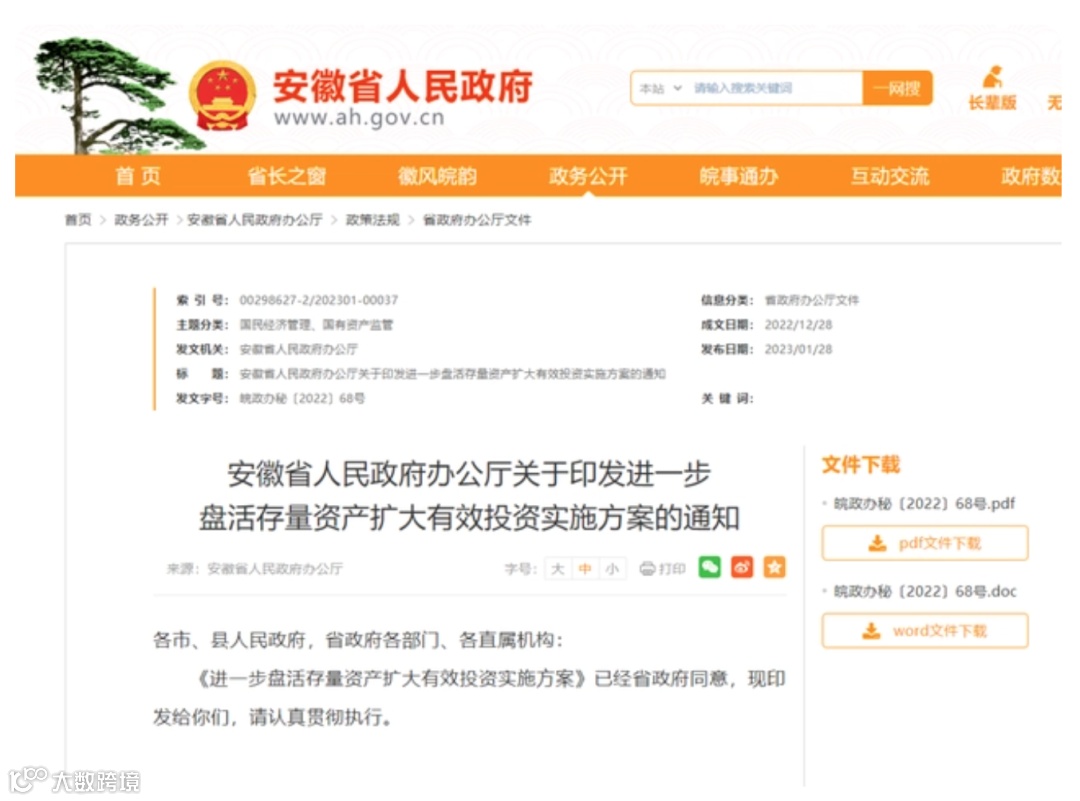 安徽省政府网站发布《安徽省人民政府办公厅关于印发进一步盘活存量资产扩大有效投资实施方案的通知》,正式印发了盘活存量资产、扩大有效投资的实施方案。