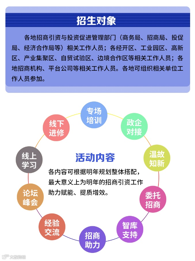 导读:线上线下、引进来走出去全方位培训+搭建政企平台助推地方双招双引,敬请关注