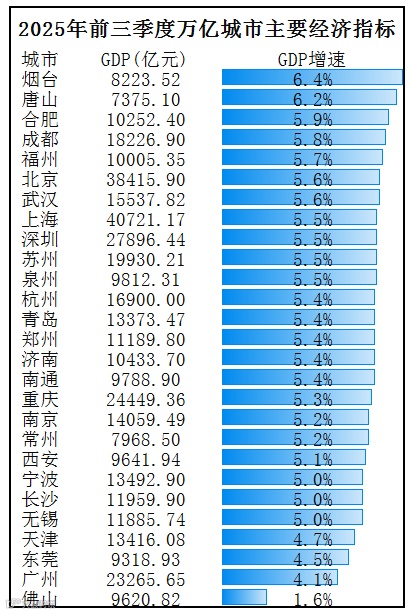 今年,唐山更是猛踩油门,前三季度GDP增速高达6.2%,在所有万亿城市中排名第二;具体到第三季度,更是在万亿城市中遥遥领先。