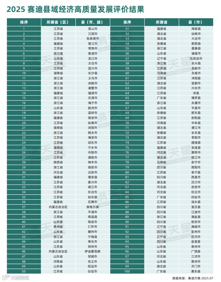 2025年7月23日,2025县域经济创新发展论坛在北京成功举办。赛迪顾问会上发布了《2025中国县域经济高质量发展研究》研究成果,公布了最新的中国百强县名单,招商引资内参(微信号zsyznc)第一时间选取该名单供参考。