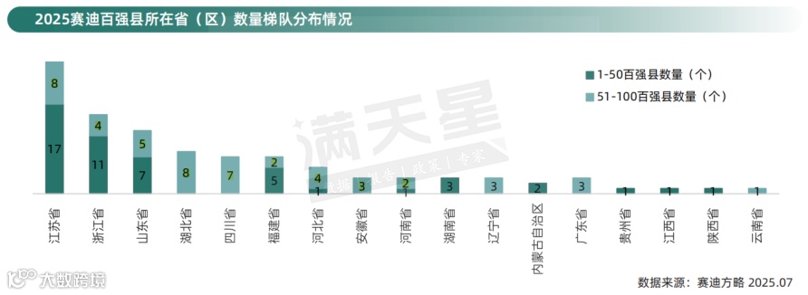 研究指出,2025赛迪县域经济高质量发展百强区域分布不均。百强县东部地区占67席,中部地区占18席,西部地区占12席,东北地区仅占3席,东部地区优势明显。整体呈现出“强县强省”特征,江苏省、浙江省、山东省三省表现突出,分别占25席、15席和12席,百强县前10名中江苏省独占6席,并包揽前3位。