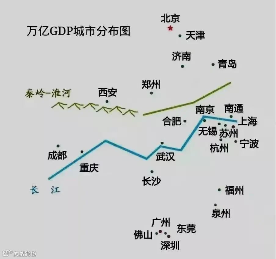 这是中国万亿GDP城市的分布,分布就在长江流域。